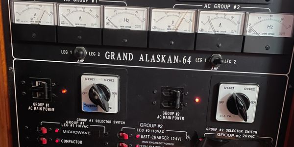 There are four individual 220V shore power inputs, two at the bow, two astern. Her aft shore power cord is supplied with a Glendenning Cablemaster. While away from the the dock, Calusa's AC power is generated by either 9KW or 16KW Northern Lights Genset. While cruising, her main engines are coupled to two, 5KW cruising generators which can run everything from HVAC to the hot tub. Inverter loads are maxed at 6KW.