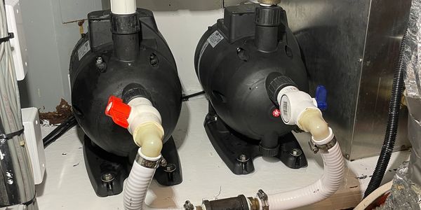 Calusa holds 350 gallons of fresh water in one stainless steel tank located mid-ship. Water is supplied by two 120V headhunter pumps (for redundancy). All water is sterilized through a UV light before making it way to a fixture.