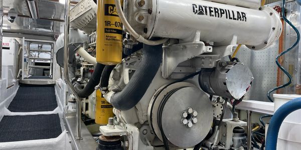 Caterpillar 3196 main engines are coupled to a 2:1 ZF gearbox. Each engine is turbo charged and intercooled and produces 660HP. Each CAT is an in line six and electronically controlled with Gendenning units with manual emergence overides.