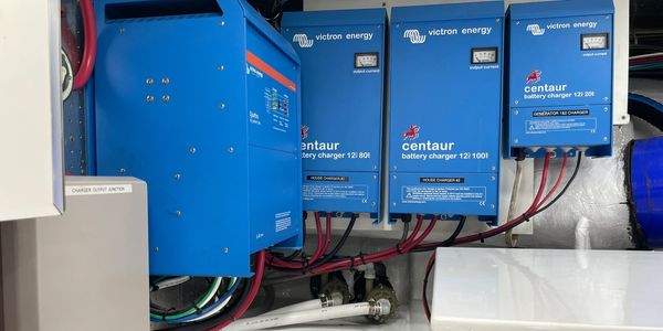 Powered with all Victron chargers and inverters, all systems are monitored through a Victron BMS that can be remotely accessed. There are 7 individual battery banks on board. Each engine and generator, house and bowthruster have separate banks. The DC voltages on board are 12V and 24V. All batteries are Lifeline AGM's.