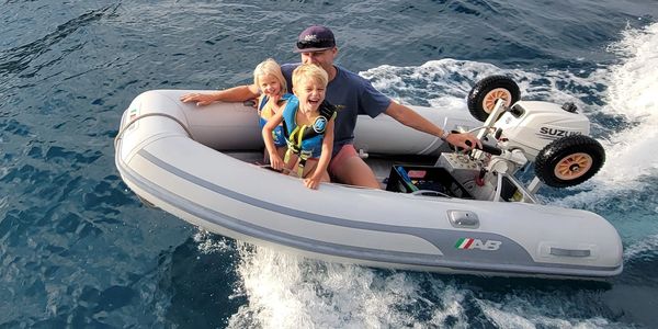 Aptly name the Duckling, this little rubber boat serves one purpose in life: to get her crew to and from the beach. The "Duck" is an extremely lightweight, aluminum-hill AB rhib. She is propelled by a 2025, Tohatsu, 6hp outboard. The Duck is equipped with landing wheels and an aluminum fuel cell. He standard on-bard equipment includes cupholders, aluminum shovels, water, and beach toys.